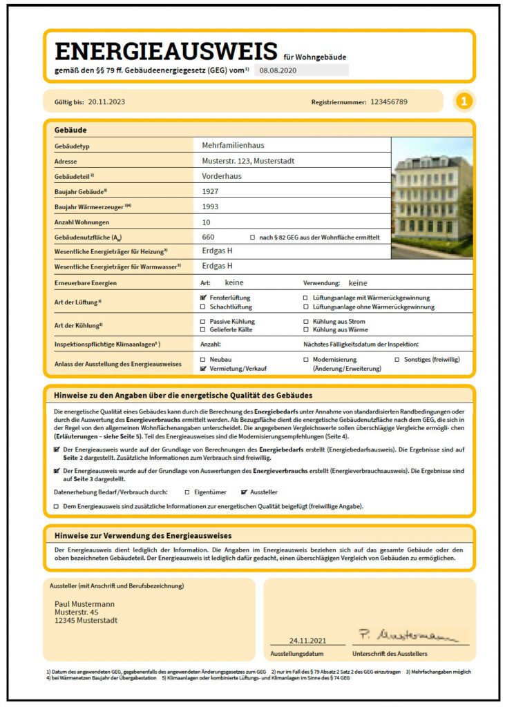 Er zeigt, wie effizient Ihr Gebäude mit Energie umgeht – inklusive Effizienzklasse, Energiebedarf/-verbrauch und Modernisierungsempfehlungen.