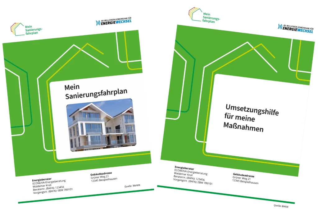 Der iSFP besteht immer aus zwei Dokumenten: „Mein Sanierungsfahrplan“ und „Umsetzungshilfe für meine Maßnahmen“. Beide erhalten und besprechen Sie mit uns persönlich.